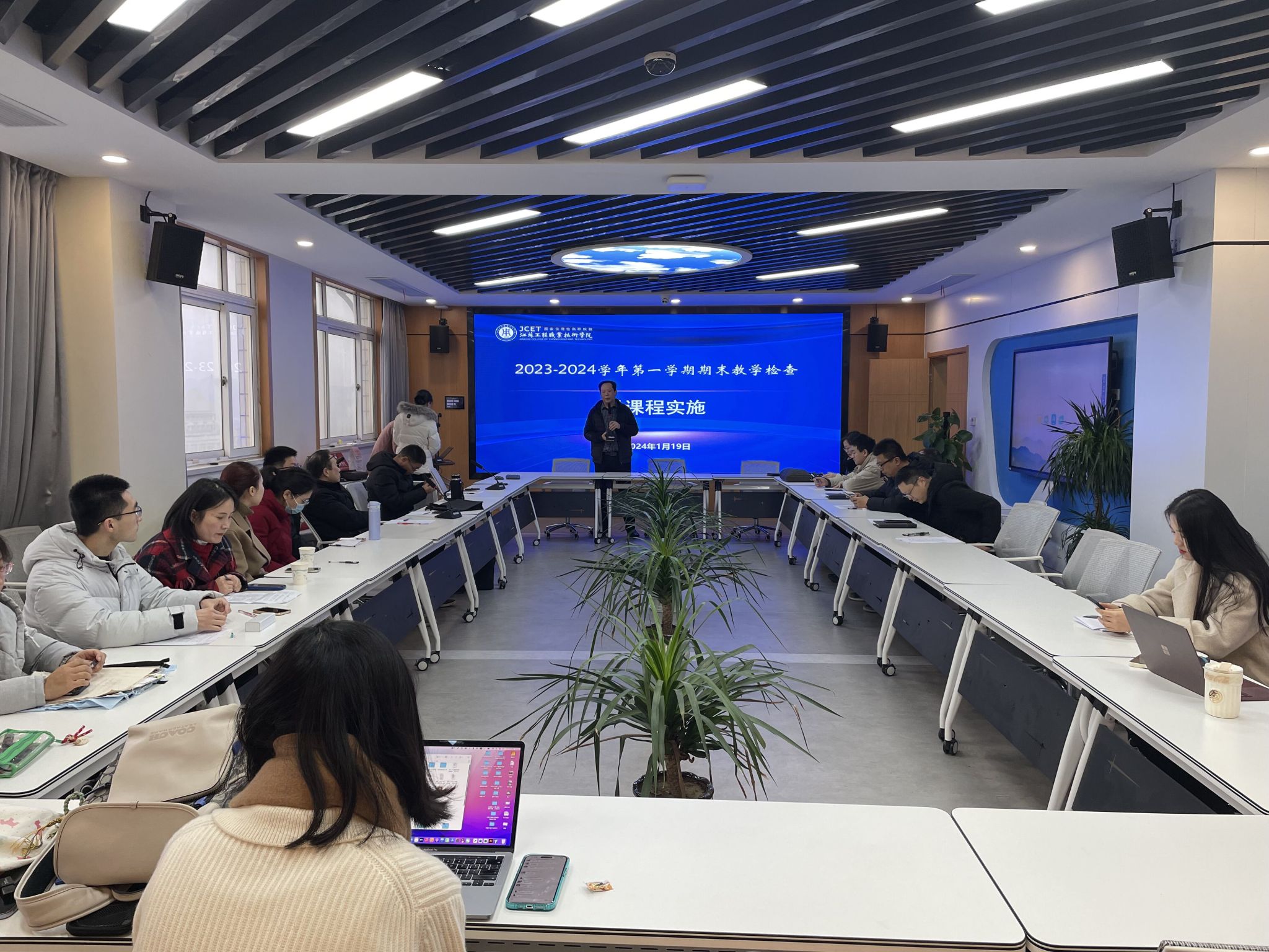 1月19日上午,教务处在崇謇楼704教学大数据中心举行“说课程实施”期末教学检查活动。本次活动共有来自10个教学单位的20名教师进行了教学实施情况展示,教务处和各教学单位相关负责同志共同参加。