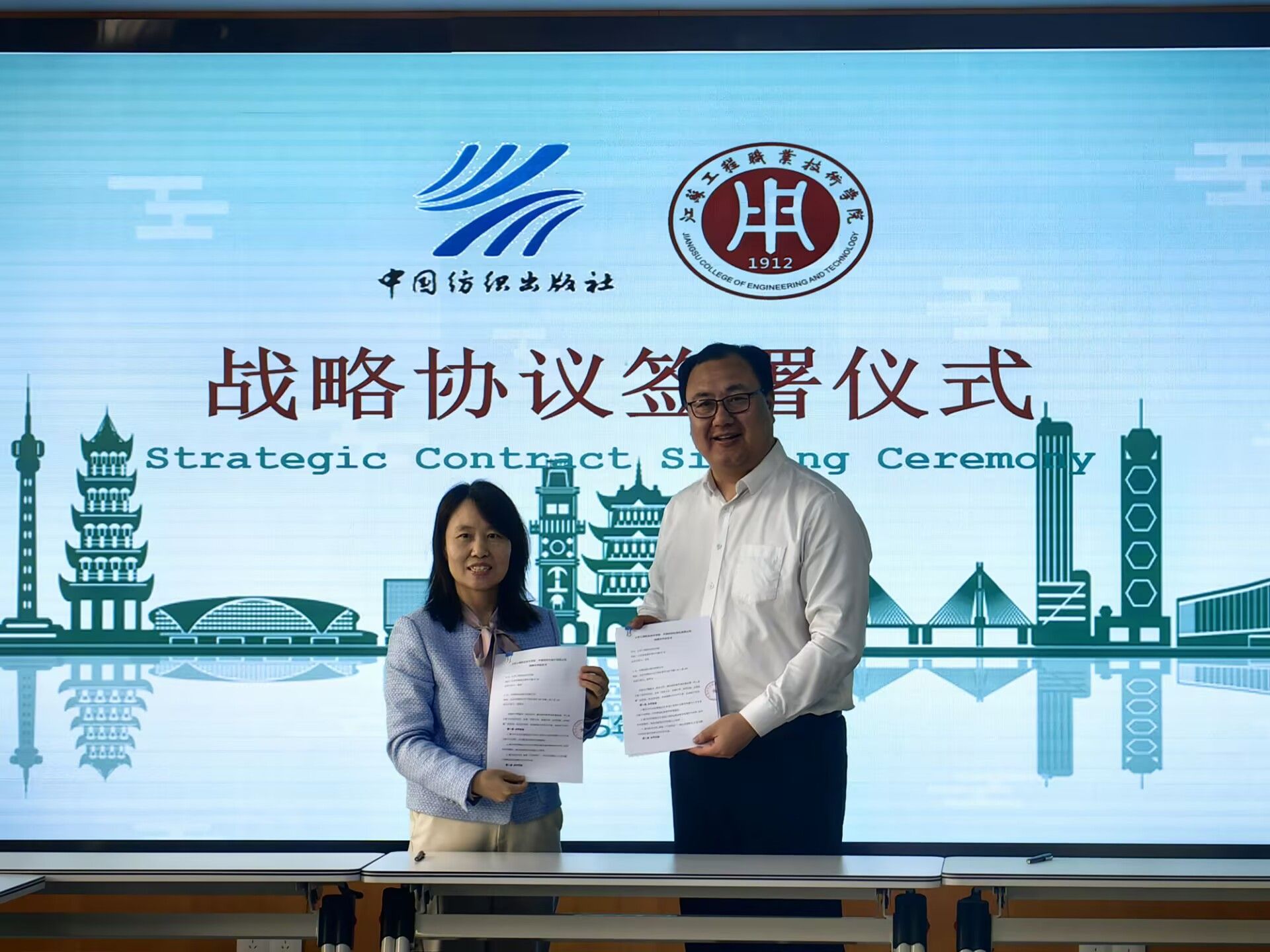 会上,学校与中国纺织出版社共同签订了战略合作协议,并举行“纺织服装职业教育教材研究与开发基地”揭牌仪式。