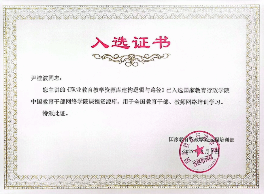 近日,副校长尹桂波教授主讲的《职业教育教学资源库构建逻辑与路径》入选国家教育行政学院中国教育干部网络学院课程资源库,并已正式在其平台进行展播,用于全国教育干部、教师网络培训学习。