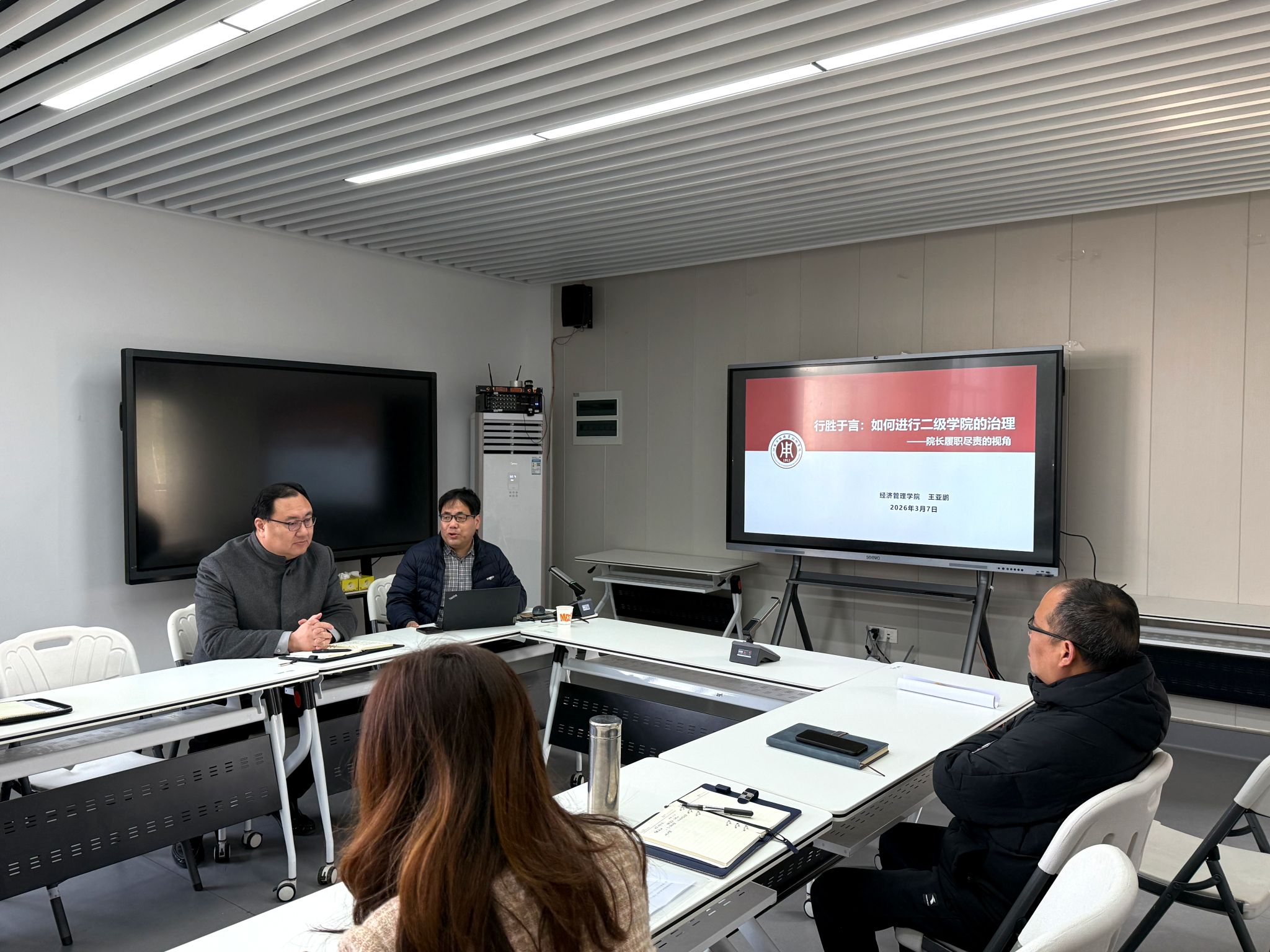 经济管理学院院长王亚鹏作了二级学院治理经验分享报告。他以制度逻辑、理论逻辑、实践逻辑、实干巧干四个维度为框架,结合职教热点,系统阐述了学院在专业建设、师资发展、课堂教学改革等方面的系列举措与思考。尹桂波充分肯定了学院在专业动态调整、教师教学比赛、学院稳定发展等方面取得的改革成效,希望各教学单位主动学习研究、实干笃行、勇于担当,探索适合本部门提升发展的路径。